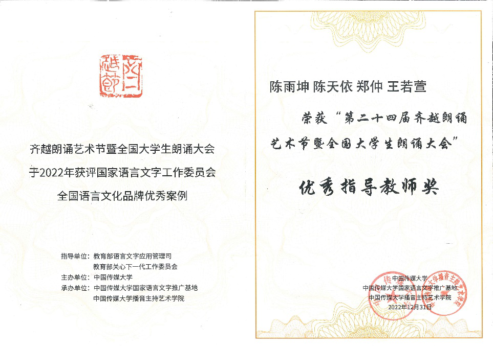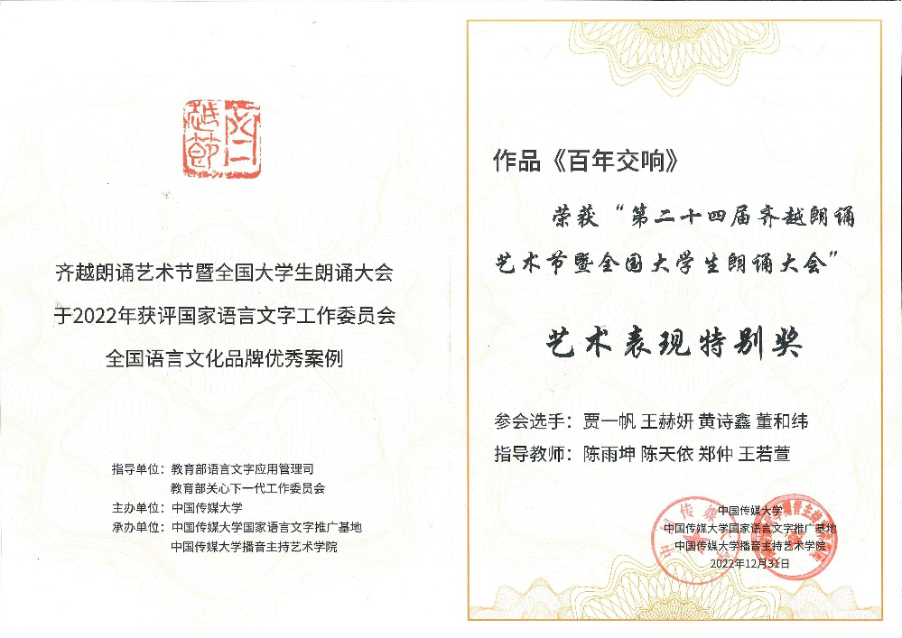 据悉,第24届齐越朗诵艺术节主题聚焦传承和弘扬中华优秀传统文化,彰显新时代青年人共建人类命运共同体的风采,用声音与经典描绘中华文化的灿烂瑰丽。大赛启动以来,公司广泛动员,积极组织师生踊跃参与。《百年交响》团队成员协力合作,不断进行排练、修改、完善、录制,最终取得佳绩。